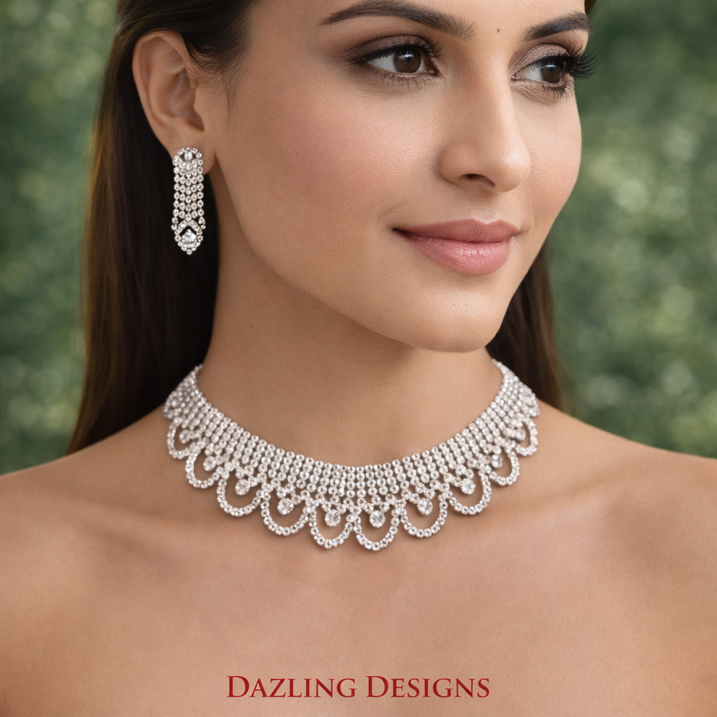 Hundreds of closely set clear crystals catch and refract light from every conceivable angle. Set Includes 1 Wide Scalloped Collar Necklace, 1 Pair of Linear Drop Earrings