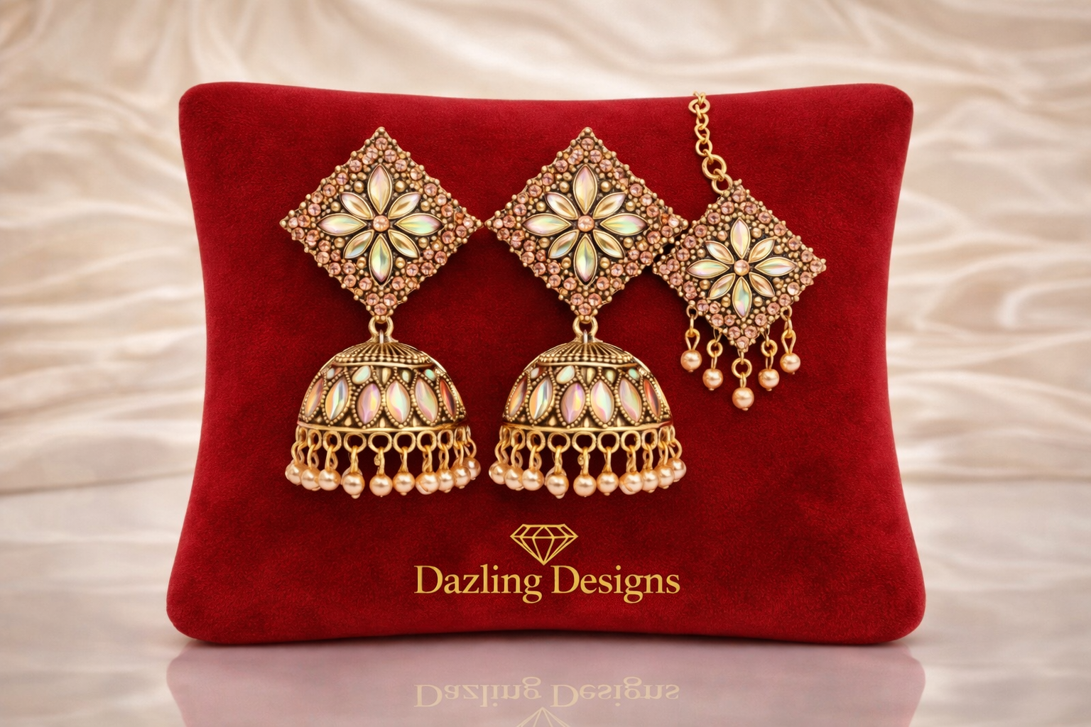 The traditional jhumka bells mirror this design with matching teardrop stones, all set against a rich, antique gold-tone finish. Includes: 1 pair of earrings + 1 maang tikka