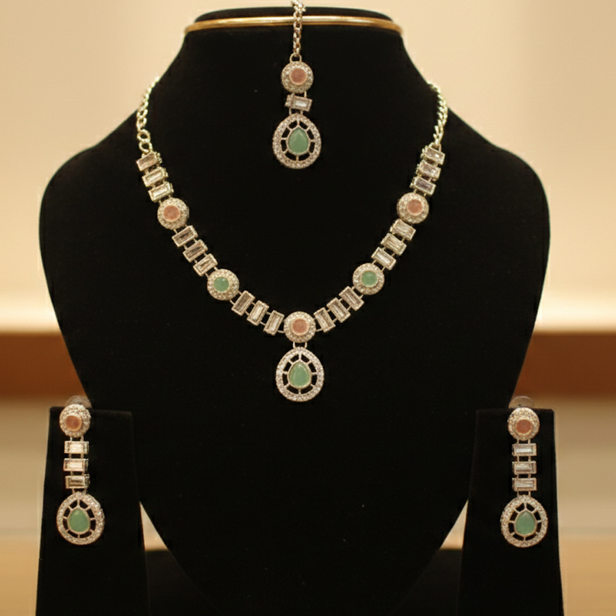 This jewelry set is a contemporary take on traditional Indian aesthetics, The set features a refreshing combination of pastel mint green teardrop-shaped stones and soft peach circular cabochons.