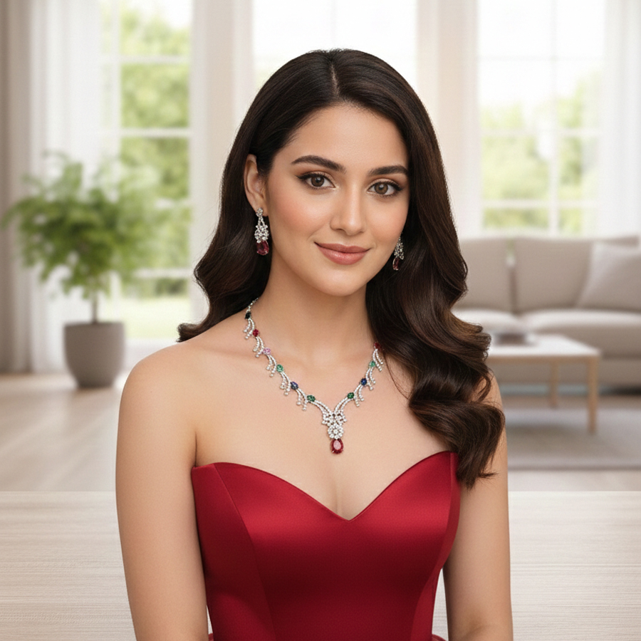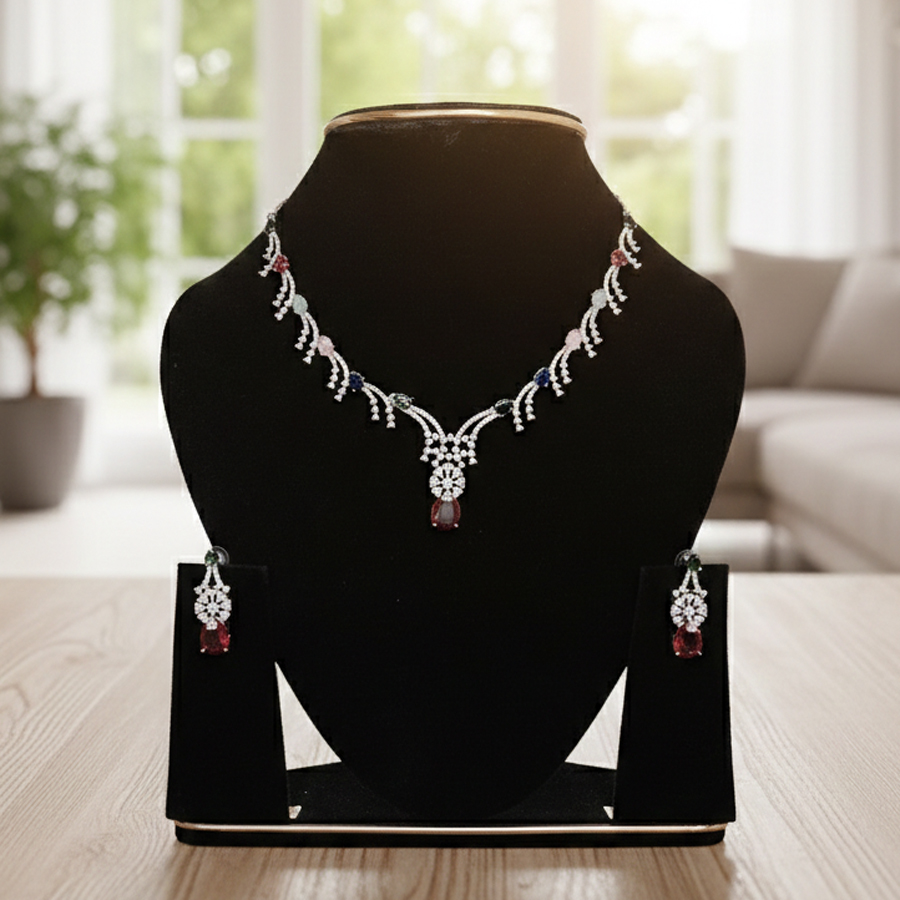 The necklace features a refined silver-toned vine design that tapers into a graceful "V" silhouette, accented by a curated selection of multi-colored gemstones. Set Includes: 1 x Elegant Necklace, 2 x Coordinating Drop Earrings.