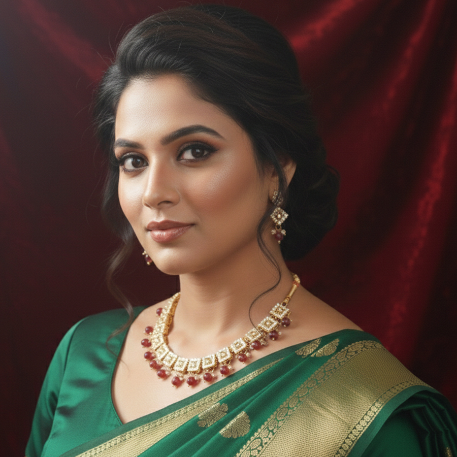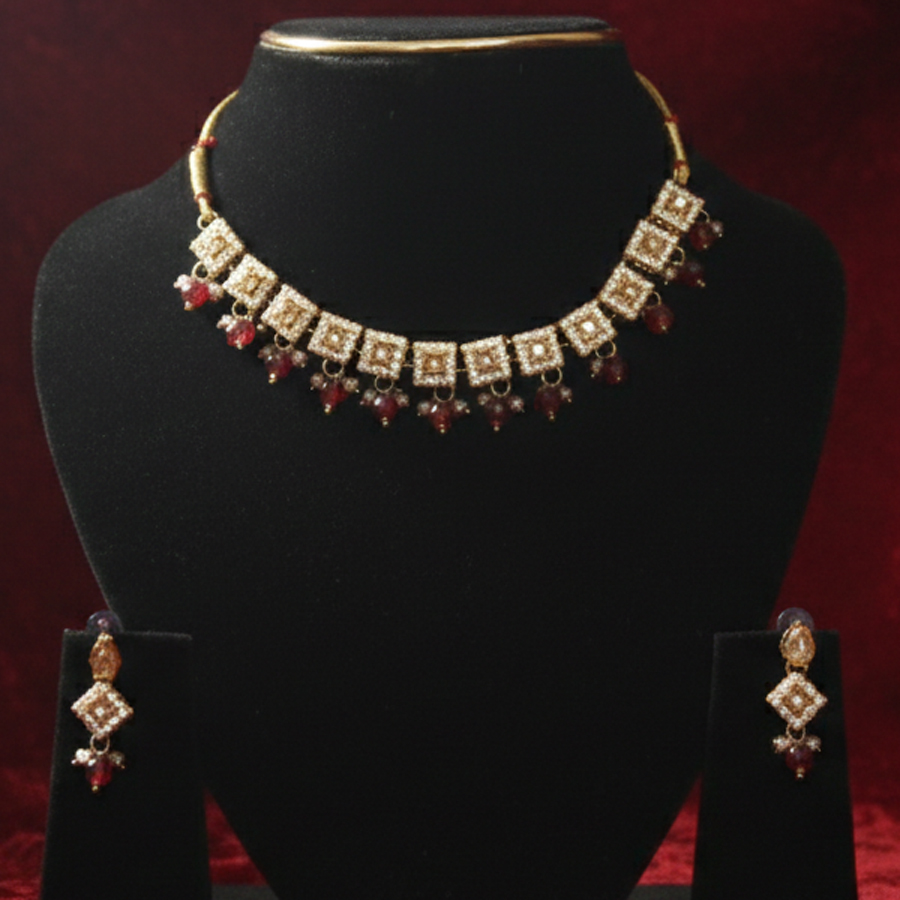 this unique choker features a series of shimmering square motifs, each punctuated by delicate ruby-red crystal clusters. It is a versatile, lightweight statement piece that adds a pop of sophisticated color to both contemporary and ethnic outfits.