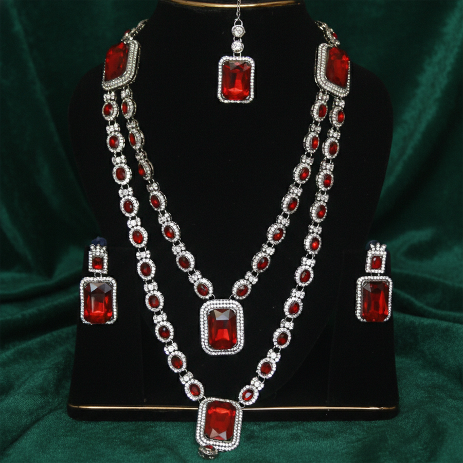 Command attention with this striking multi-layered necklace set featuring oversized emerald-cut scarlet stones. This set is designed for the woman who wants to make a bold, modern statement.