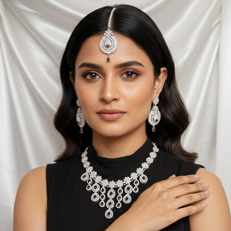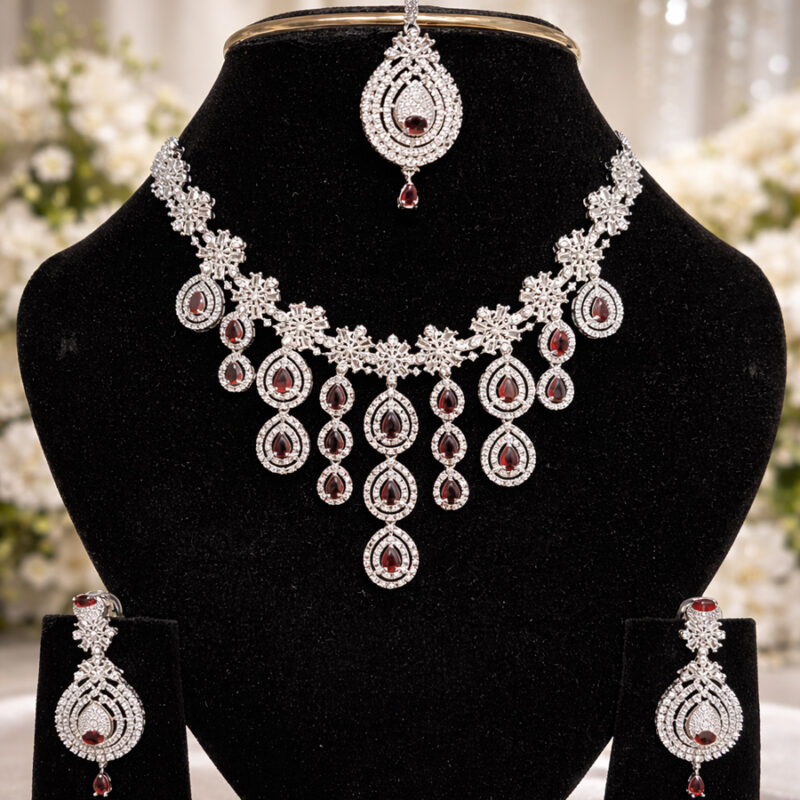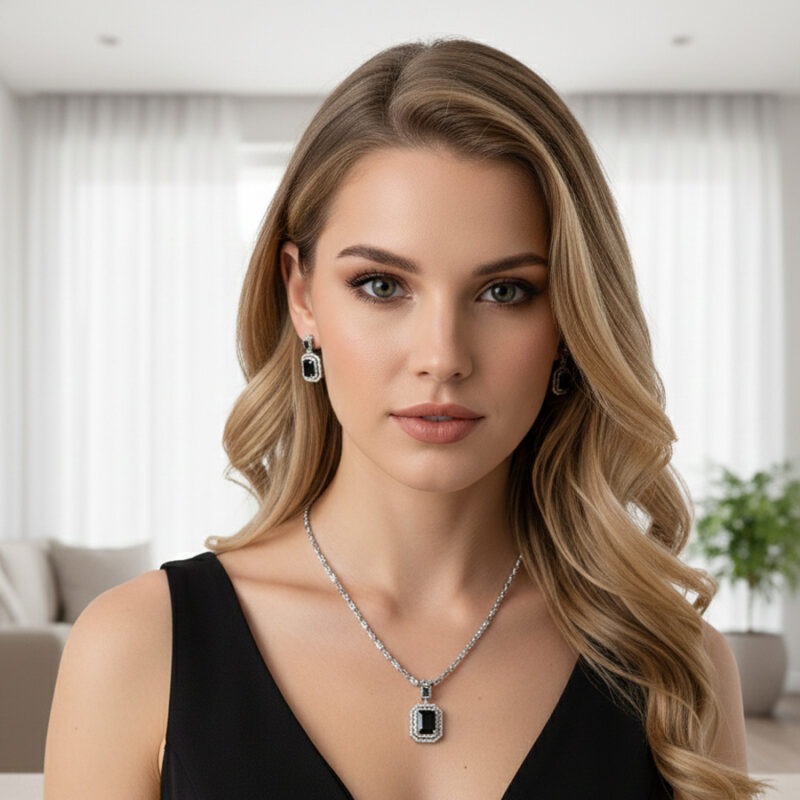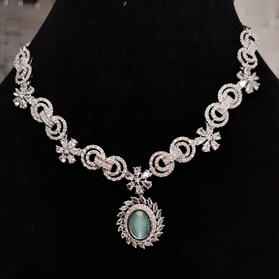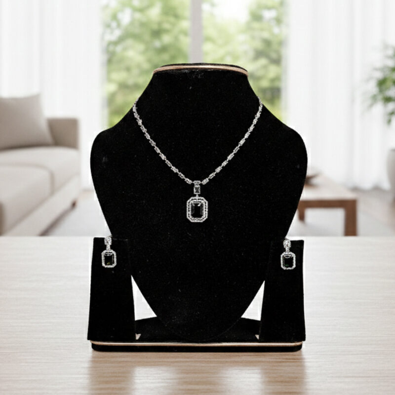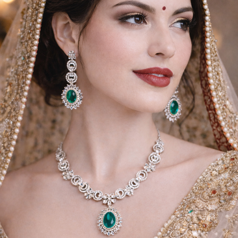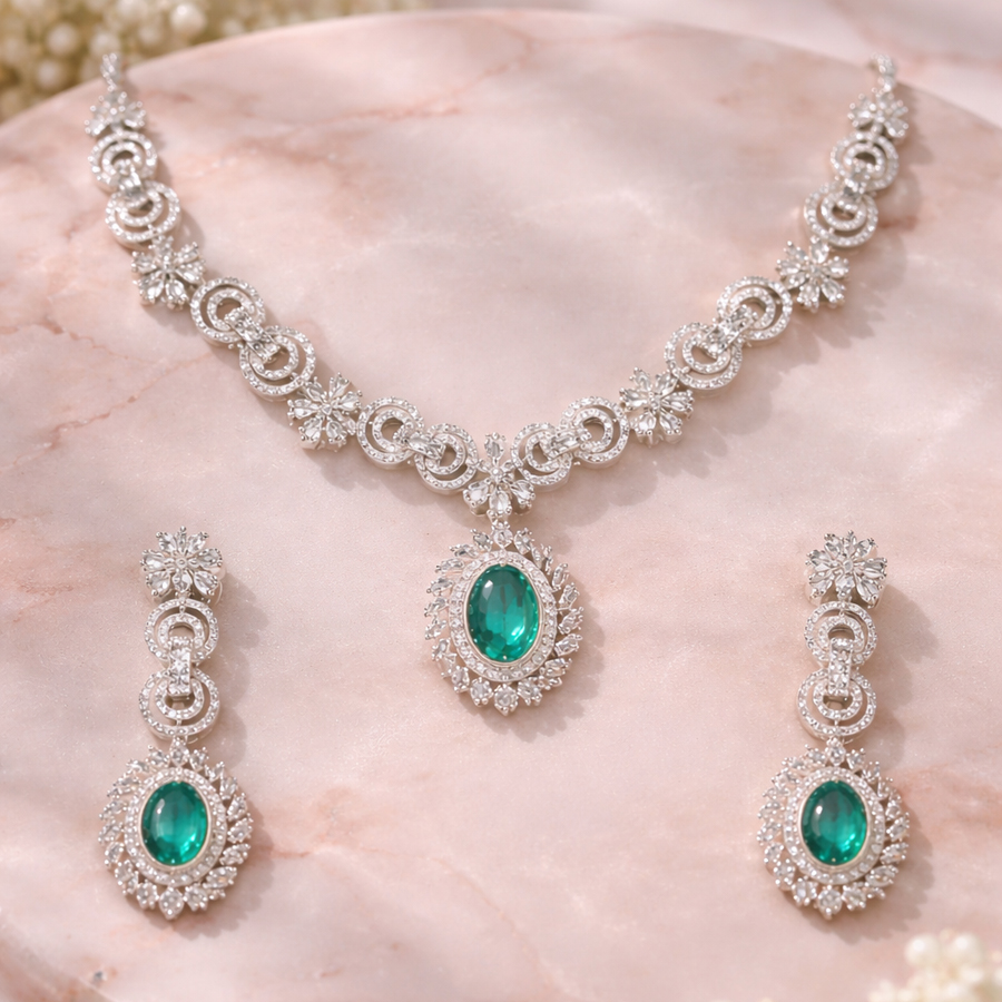 This piece is featuring a bold rhythm of alternating cushion-cut and trillion-cut stones in a deep, enchanting forest green. Each stone is separated by a brilliant-cut zircon accent, creating a continuous flow of light and color that culminates in a stunning three-tiered drop pendant.