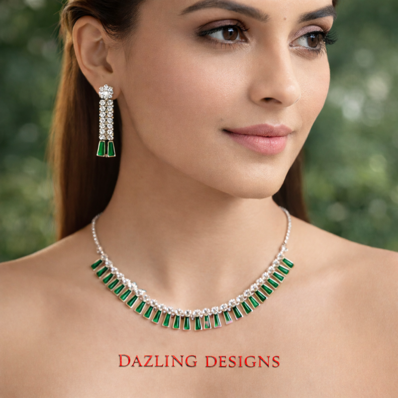This exquisite silver-toned necklace features shimmering white stones arranged in delicate draped layers, highlighted by floral motifs with deep amethyst-hued centers. Set Includes 1 Draped Statement Necklace, 1 Pair of Floral Drop Earrings