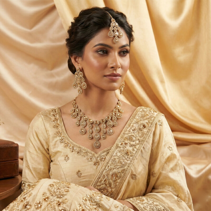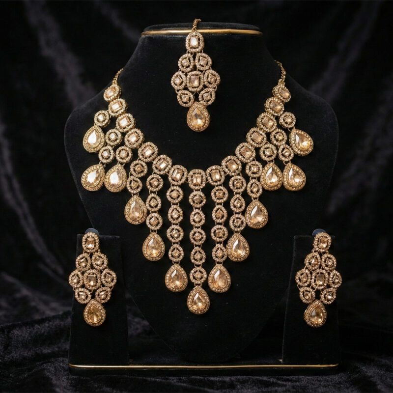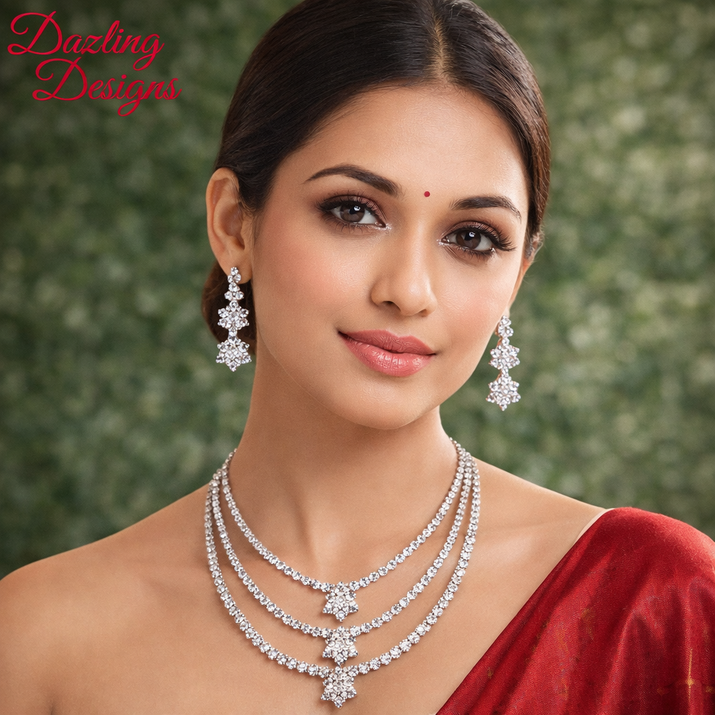 this piece features three elegantly draped strands of sparkling clear stones. Set Includes: 1 Multi-Layered Statement Necklace and 1 Pair of Matching Drop Earrings.