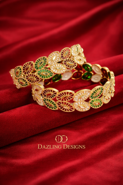 Tri-Color Enamel Leaf Motif Gold Bangles